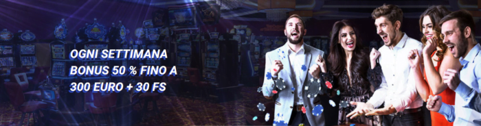 Ogni settimana puoi ricevere puoi ricevere un bonus pari al 50% del tuo deposito fino a 300€ e 30 free spins!!